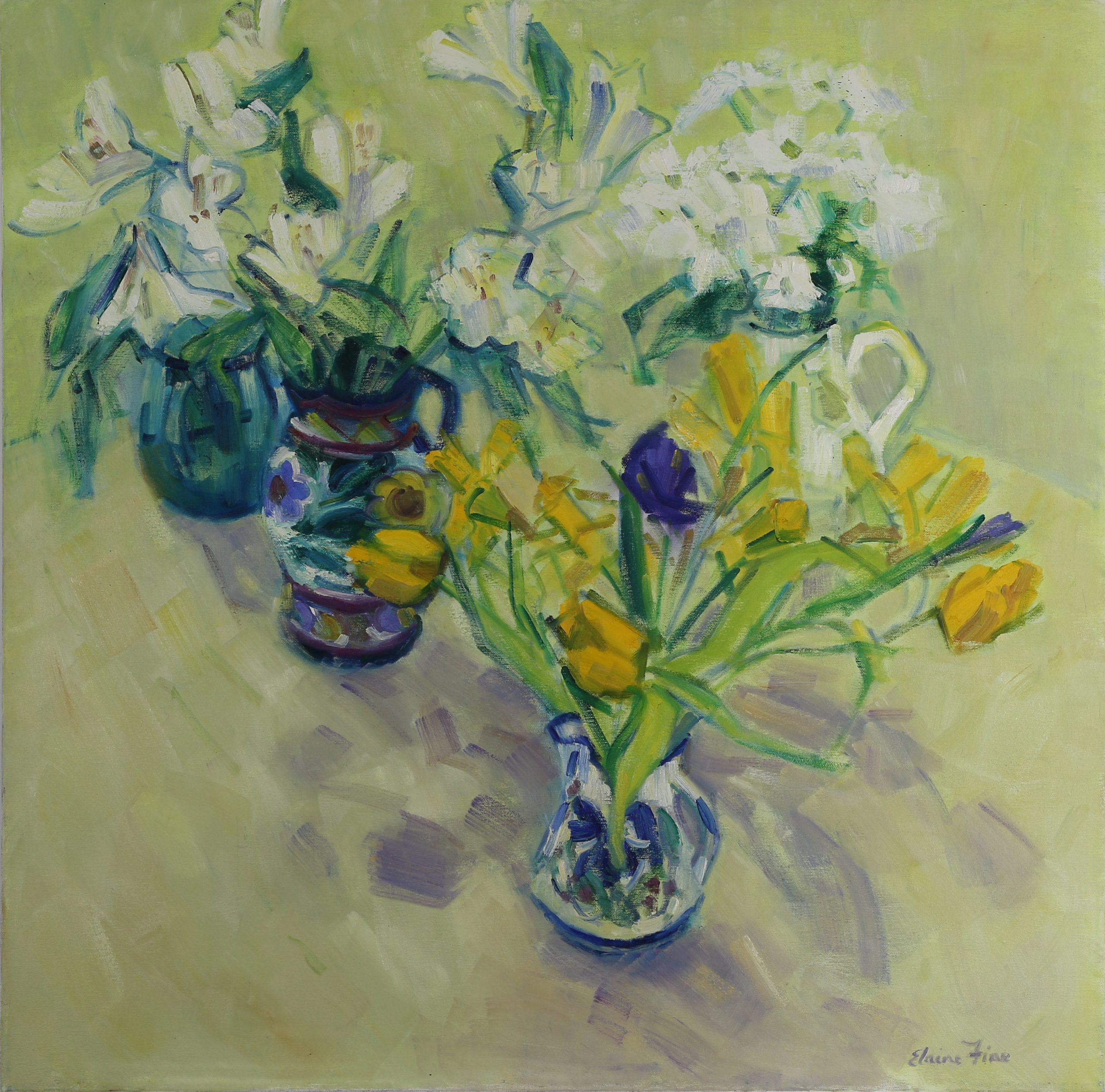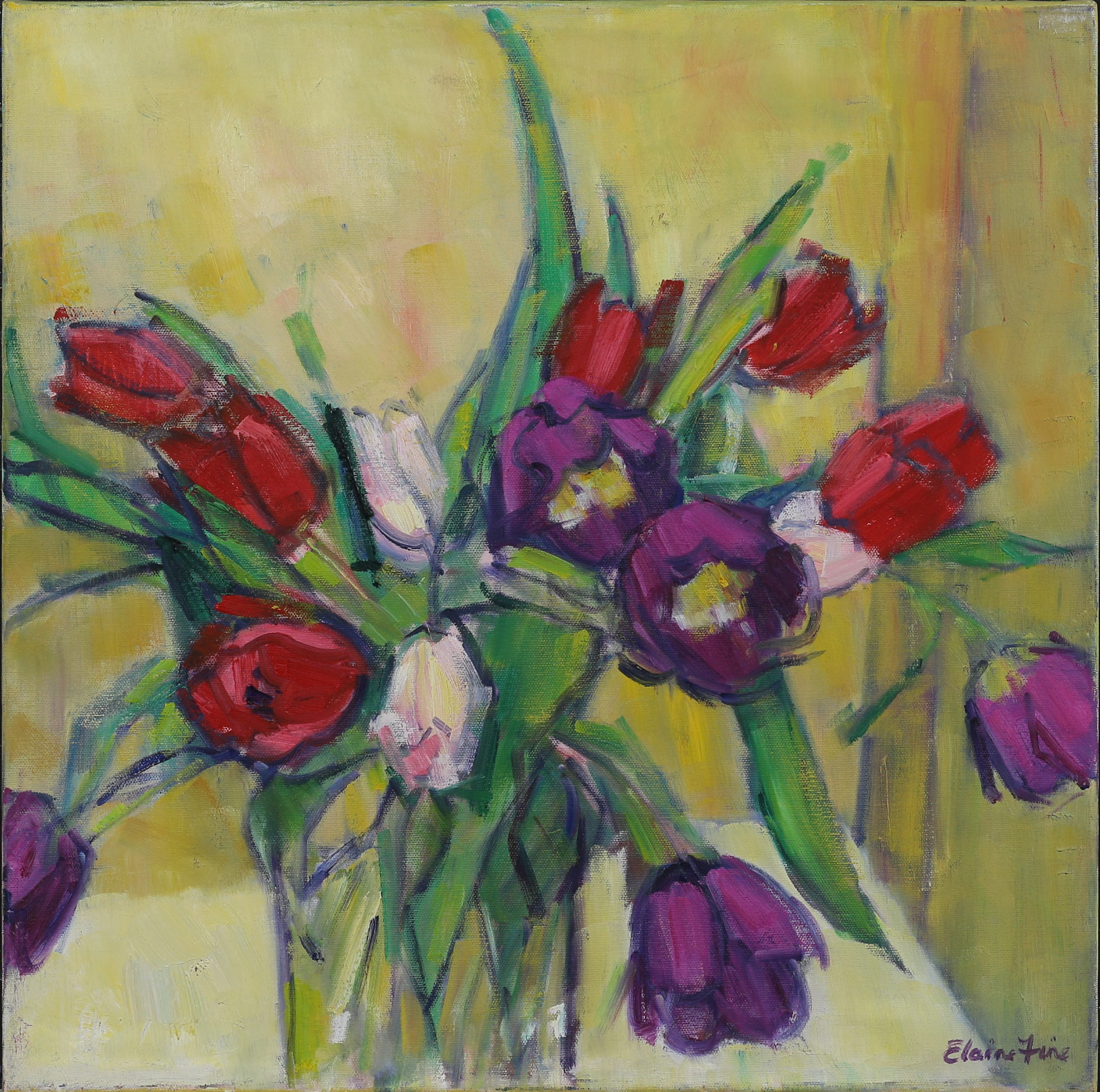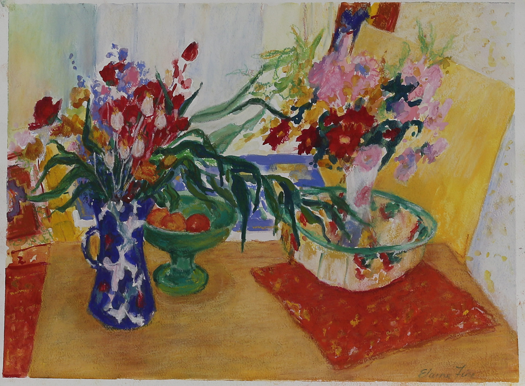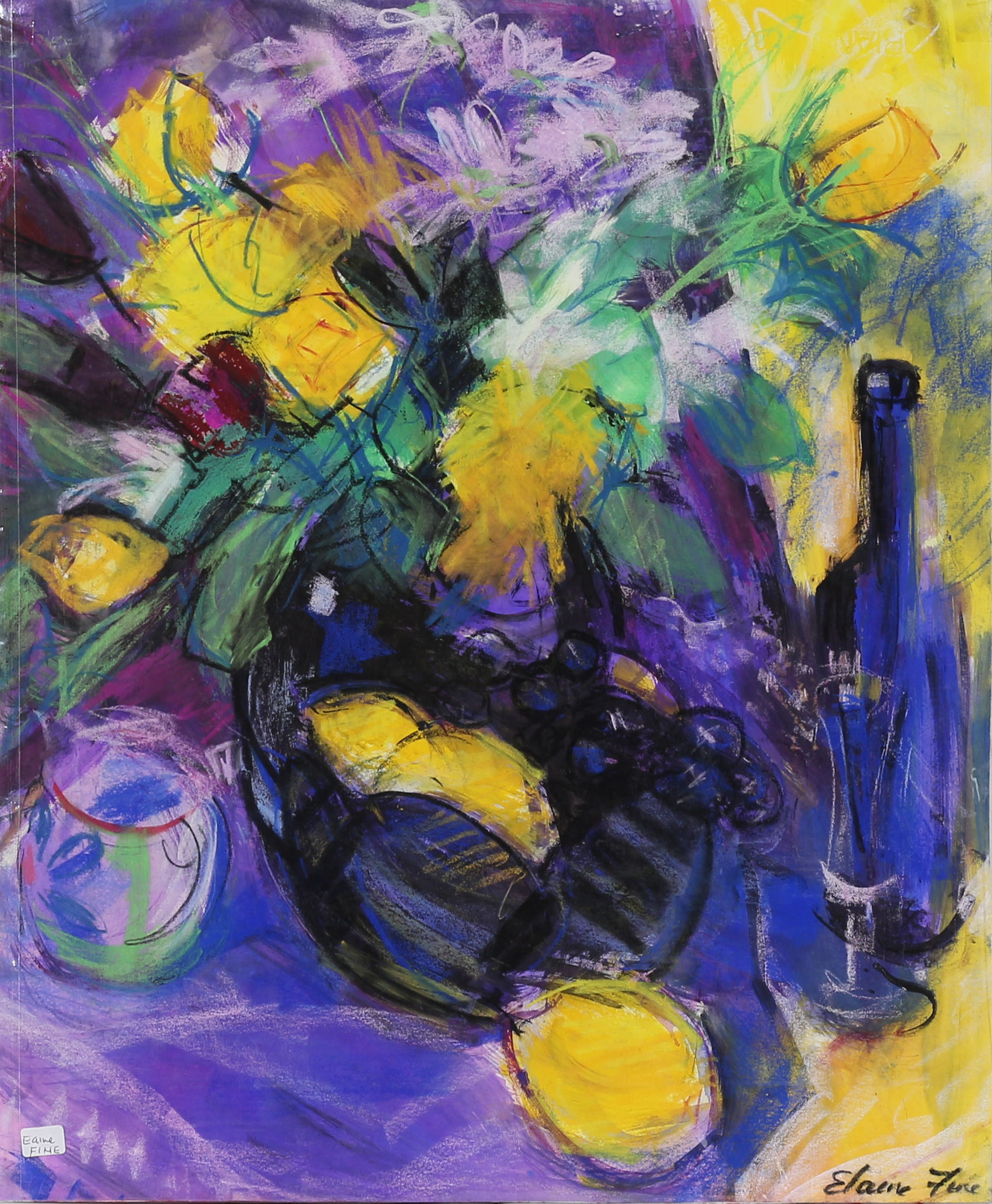 Elaine Fine’s still life paintings celebrate everyday beauty—vases, flowers, fruit—rendered with expressive brushwork, rich color, and a painterly elegance that brings quiet objects vividly to life.