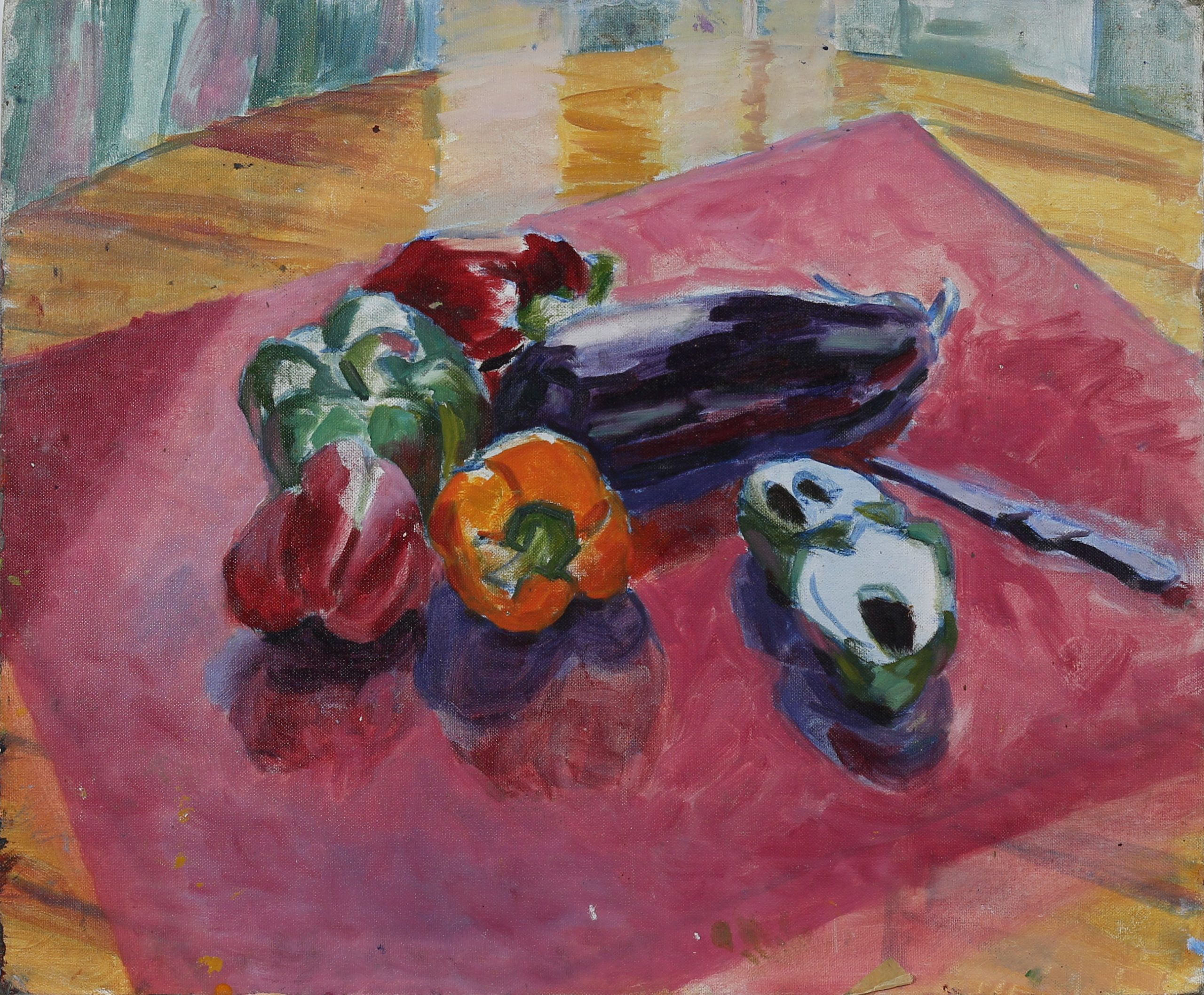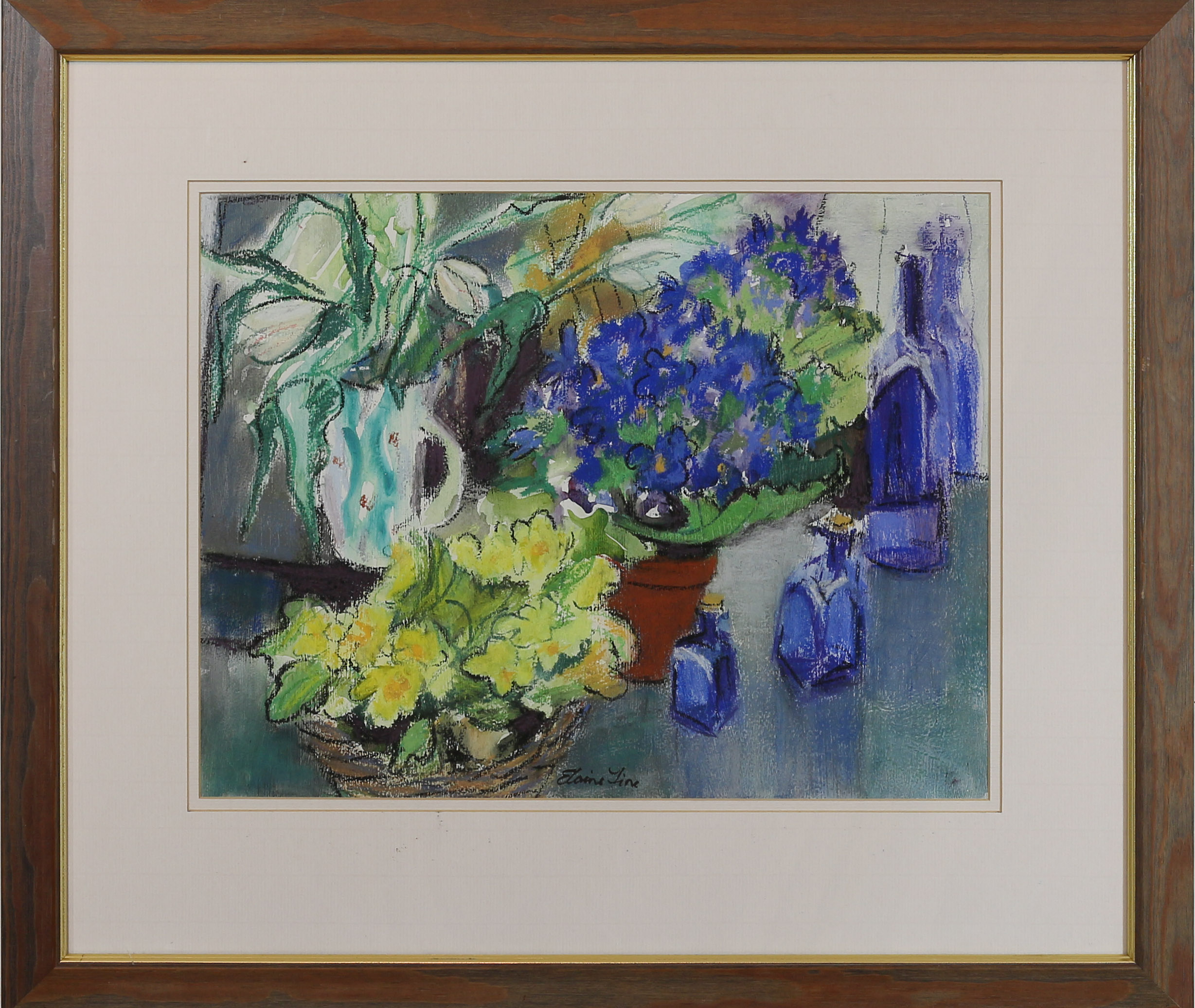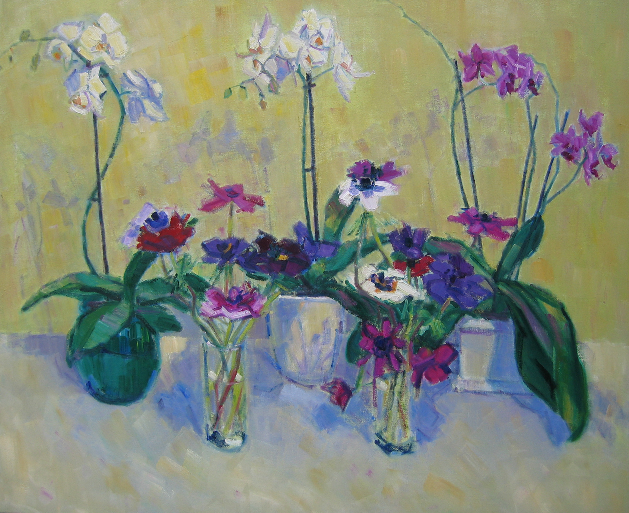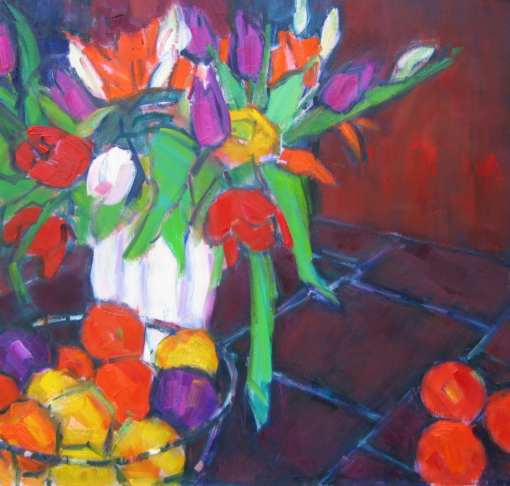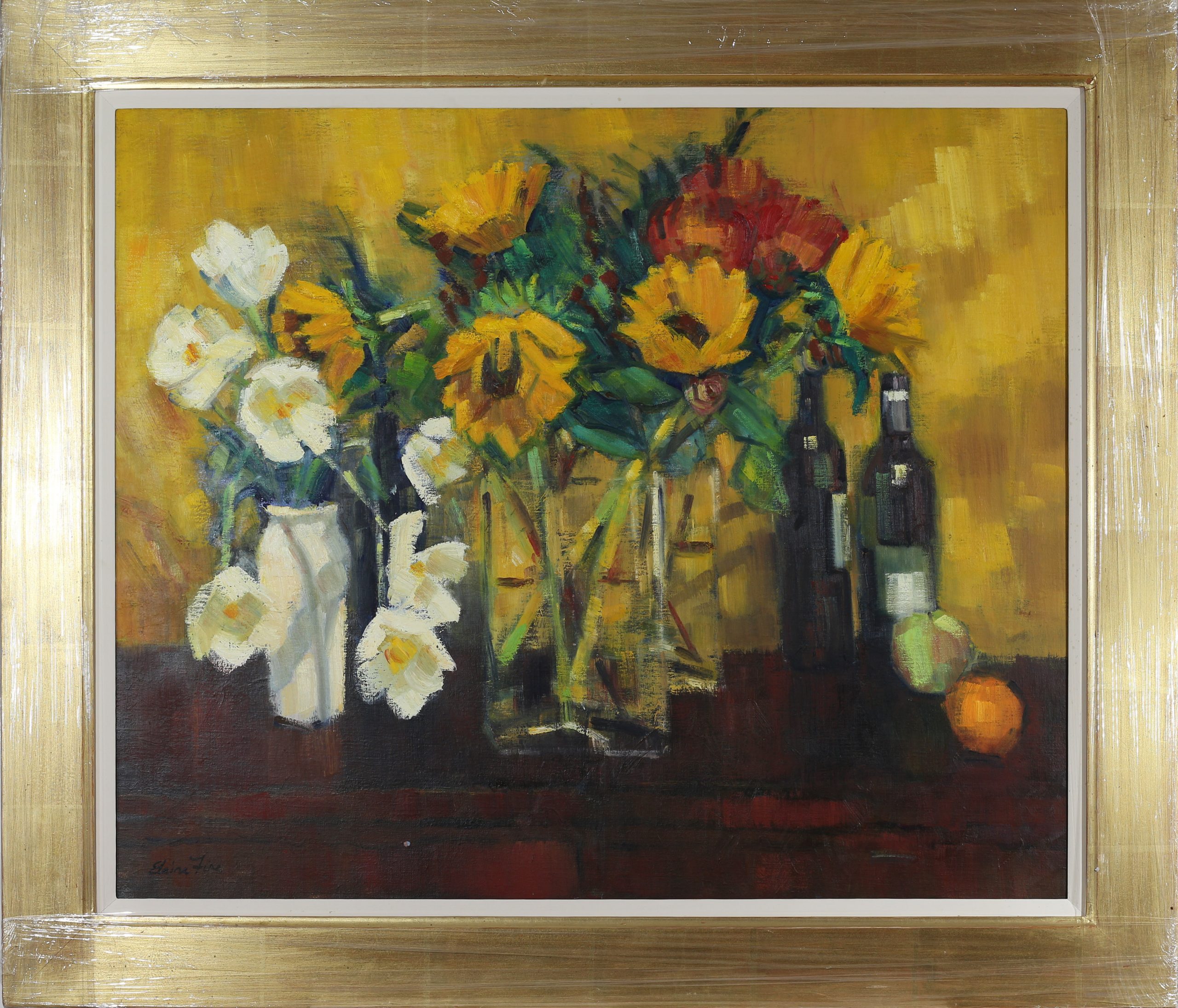 Elaine Fine’s still life paintings celebrate everyday beauty—vases, flowers, fruit—rendered with expressive brushwork, rich color, and a painterly elegance that brings quiet objects vividly to life.